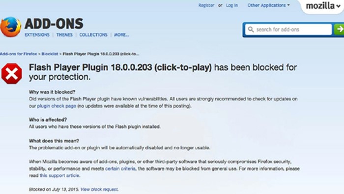 Казано по друг начин, докато от Adobe не поправят пробойните, ползващите браузъра Firefox (а и почти всички други вече въвеждат същата мярка) няма да могат да ползват контент, работещ с флаш-технологията.