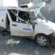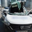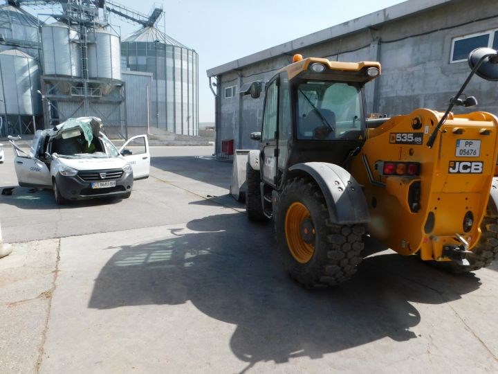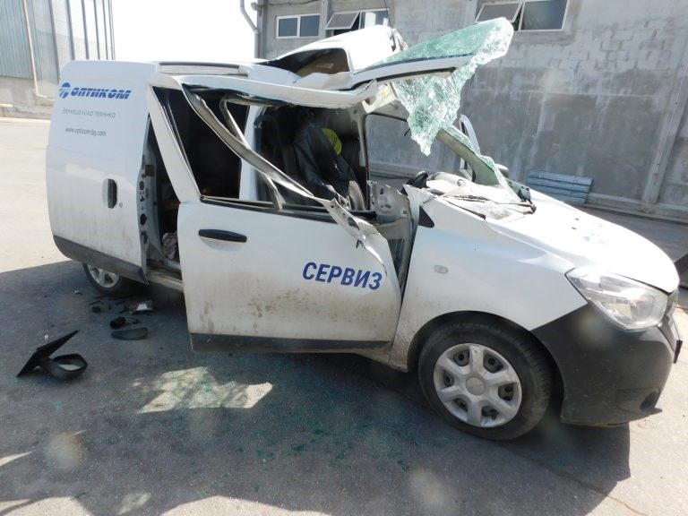 При извършване на маневра – излизане от склад, 51-годишният водач на фадромата удря с кофата ѝ движещия се автомобил „Дачия Докер“.