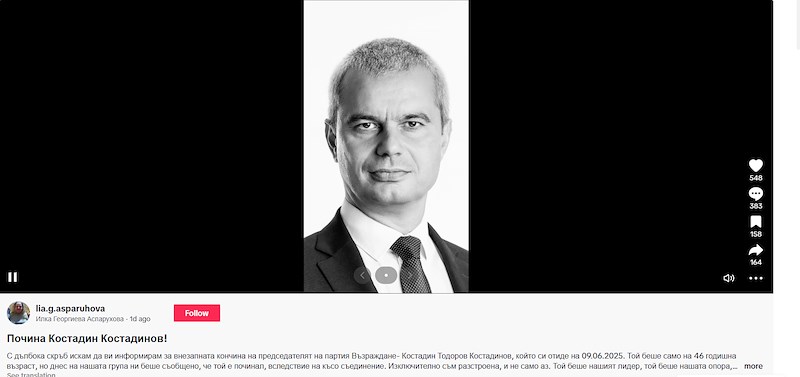 В платформата TikTok се появи поредната фалшива новина, този път за смъртта на лидера на партия "Възраждане" Костадин Костадинов. Манипулативното видео бързо набра популярност и предизвика масова заблуда сред потребителите в социалната мрежа.