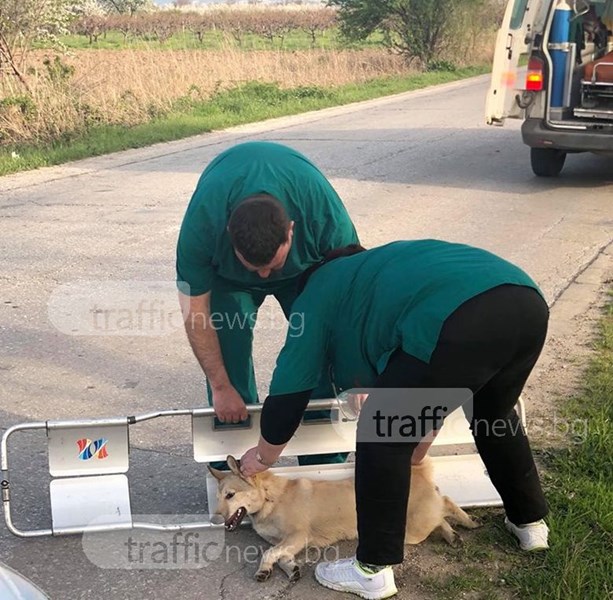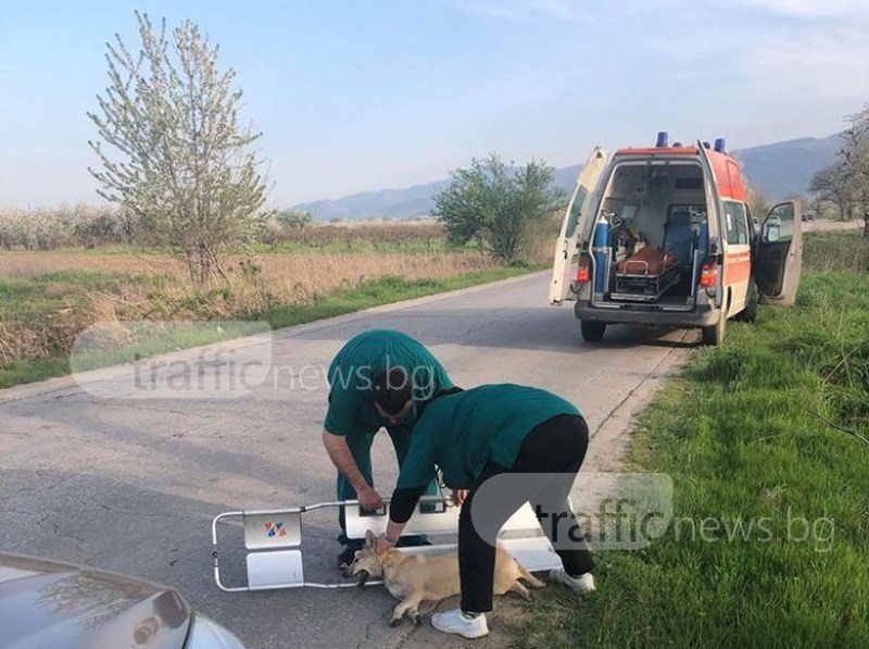 Случката е отпреди минути по пътя от Пловдив за Брестник. Животното е ударено от кола, чийто шофьор очевидно не е счел за нужно да спре, и пътуващите в този момент д-р Николай Вършилов и Дияна Плачкова го виждат простряно на пътя. Двамата спират, за да се опитат да помогнат. Единствената кола, която е спряла пък да помогне на двамата, е била линейката с екипа на Центъра за спешна медицинска помощ, информира Traffic News.