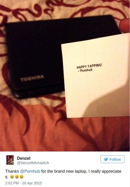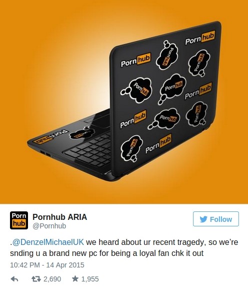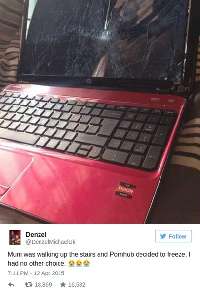 Потребител на Pornhub е бил хванат в крачка, докато се любува на поредното видео, когато чува, че майка му се качва по-стълбите. В паниката, лаптопът забива на конкретна неприлична сцена. Героят е отчаян и го счупва в коляното си, за да не бъде заловен. След трагедията, човекът качва снимка и казва, че не е имал друг избор. Компанията веднага отговаря и изпраща нов лаптоп за своя лоялен фен.