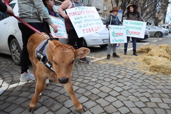 Протестиращите пред министерството в понеделник изсипаха слама пред сградата и бяха довели теле, което държаха на каишка. Те държаха лозунги, които гласяха: "Аз искам да съм фермер в България", "Искам да има хуманно отношение към фермерите", "Не убивайте българския фермер" и др.