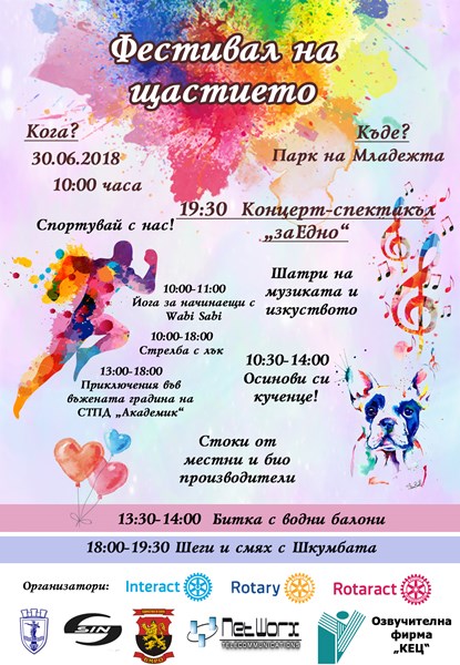 Младежите от Интеракт и Ротаракт клуб Русе към Ротари клуб канят всички жители и гости на гр.Русе на едно шарено посрещане на лятото с първият по рода си „Фестивал на щастието” - един нов, вълнуващ, изпълнен с емоция проект.