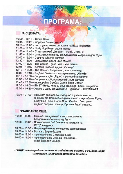 За най-малките са подготвени хиляди игри и забавления като фейс пейнтинг, битка с водни балони, „Не се сърди човече“ и много други забавления. Следобед посетителите ще имат възможността да се впуснат в едно истинско приключение, ходейки по въже и катерейки се във въжената градина на СК“Академик“ към Русенски университет.