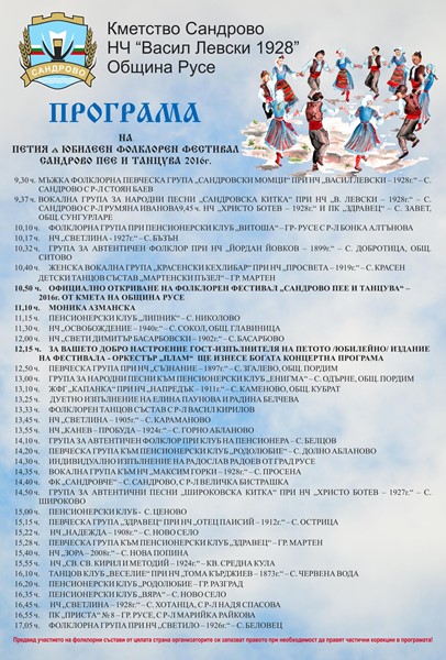 Празникът ще започне в 9,30 ч. с изпълнения на домакините от Народно читалище „Васил Левски – 1928 г.“ – с. Сандрово, а участията ще продължат до 17,30 ч. За първото юбилейно издание организаторите са поканили гост-изпълнител – орк. „Плам“, който в обедната пауза ще изнесе концертна програма.