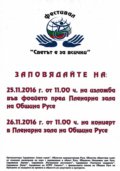 В дните, 25 и 26 ноември 2016 г. в Русе ще се проведе за осми път фестивалът „Светът е за всички“.
