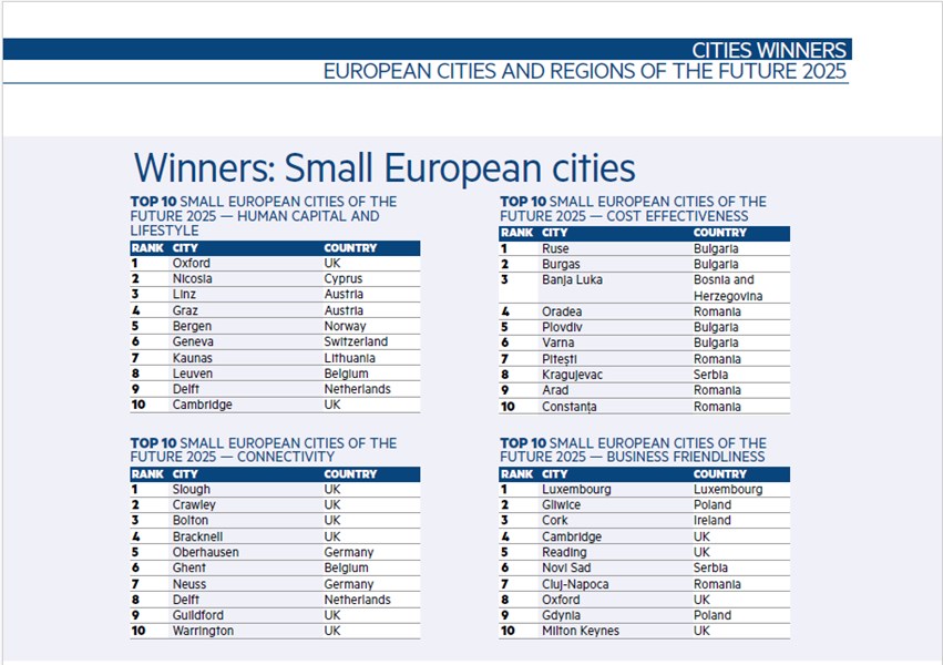 Русе затвърди позицията си като водеща инвестиционна дестинация в Европа, след като зае първо място в престижната класация на fDi Intelligence „Европейски градове и региони на бъдещето 2025" в категорията „ефективност на разходите - малки градове". Подразделението на Financial Times постави Дунавския град пред Бургас, Пловдив, Варна и редица градове от Румъния, Сърбия и Босна и Херцеговина.