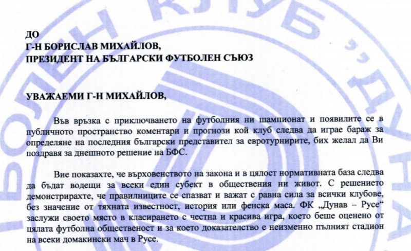 Благодарствено писмо до президента на Българския футболен съюз за днешното решение на Спортно-техническата комисия относно определянето на отборите, добили право на участие в Лига Европа, изпрати ръководството на ФК „Дунав“.