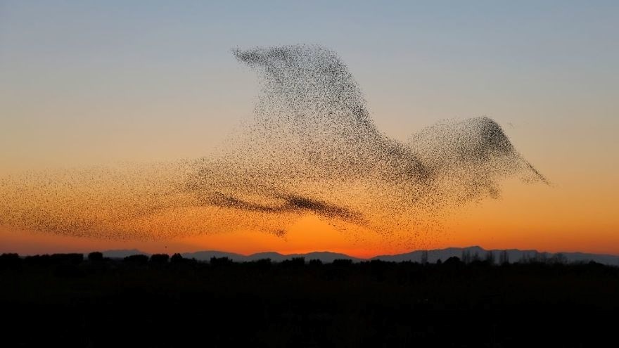 Подобно нещо се случва в Коста Брава, Североизточна Испания, когато голямо ято скорци започва да се събира в координиран облак, разказва BoredPanda. Това явление е истинско зрелище със стотици, понякога хиляди птици, движещи се и усукващи във форма, която сякаш е репетирана и бързо може да се преобразува в други изумителни такива.