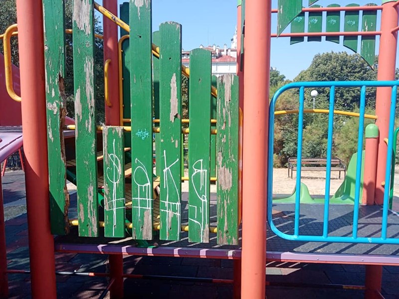 Минути след нея Лидия Цанева показа какво е състоянието на площадката на Пантеона. "Има липсваща настилка, изпочупени пейки, нужда да се пребоядиса малко, изкривени кошчета... И за разкош спринцовки с игли", изрежда възмутената русенка. "Добре, че аз намерих първа, не детето", допълва тя.