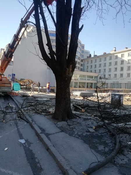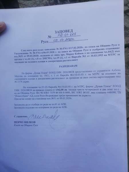 В Русе се върши поредното безчинство. Напълно здрави дървета, върху общинска собственост, се режат и унищожават от частни лица - собствениците на хотел Дунав, в центъра на Русе със заповед на кмета Пенчо Милков. Интересно дали има връзка и факта, че един от заместниците му е бившата шефка на ДунавТурс.