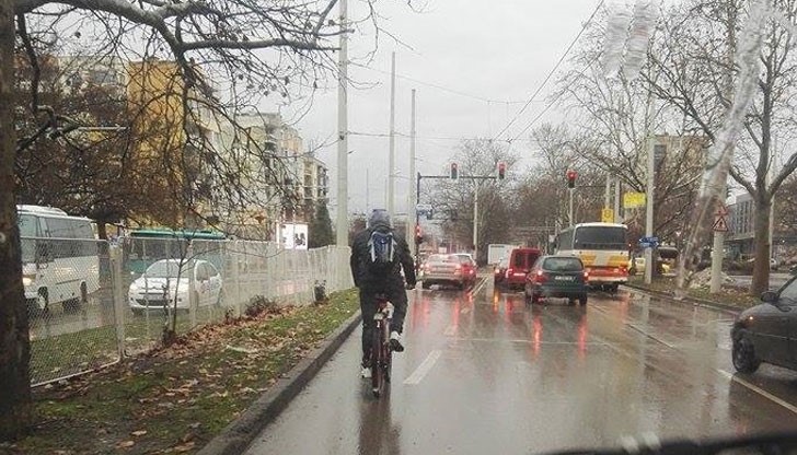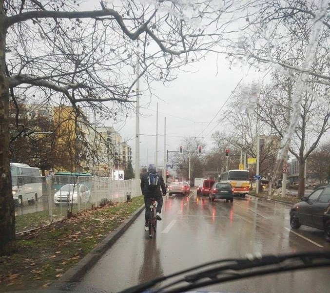 В тази тежка мокра обстановка кой ще носи отговорност ако се случи ПТП с този неразумен колоездач.