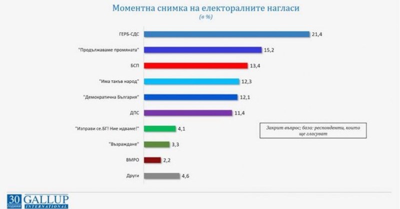 Това сочат резултатите от моментна снимка на електоралните нагласи, проведена от агенция "Галъп".