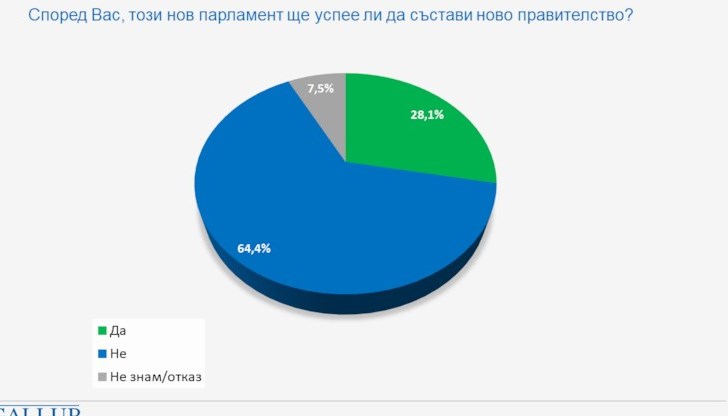 Българите в момента са подчертано скептични по отношение на възможността за съставяне на ново правителство. 64,4% казват, че такова няма да се създаде, а 28,1% смятат, че ще се създаде.