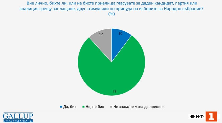 Според проучването, една десета от анкетираните открито признават, че биха приели да гласуват срещу заплащане, друг стимул или под принуда. Това число, макар и притеснително само по себе си, може да бъде дори по-високо, имайки предвид, че 12% от респондентите са отговорили с "не знам" на въпроса.