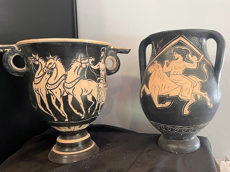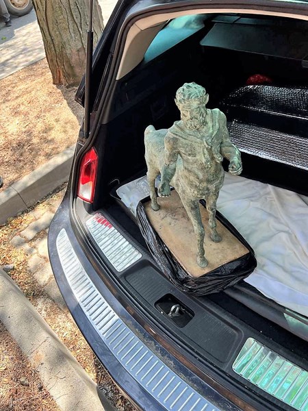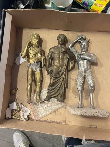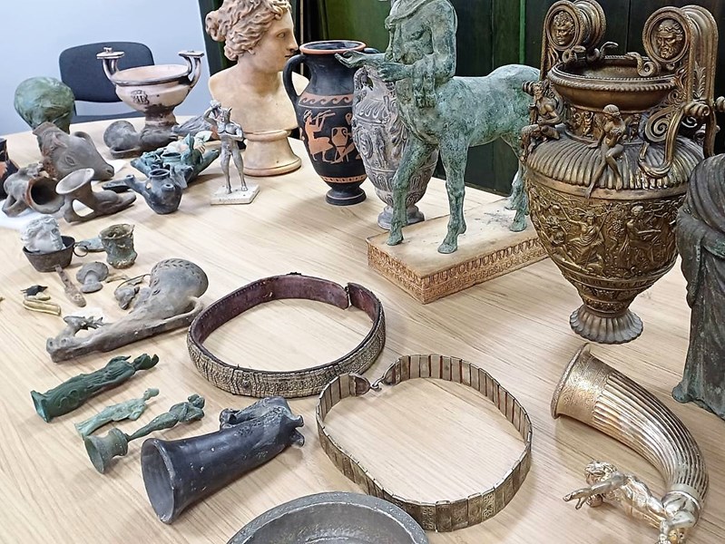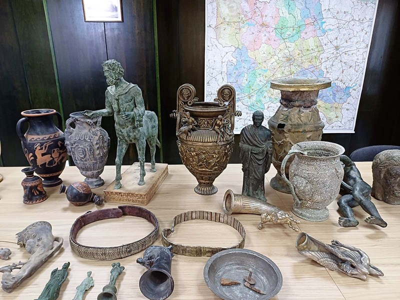 От иззетите материали са открити 345 предмета с белези на антични и средновековни находки, включително 95 монети от жълт и сив на цвят метал, 19 статуи, 10 металдетектора, множество парчета керамика и отливки от восък и други материали. Освен това, бяха открити класьори с документи, тефтери и бележки, мобилни телефони и различна техника. Правоохранителните органи също така конфискуваха огнестрелно оръжие, наподобяващо самоделна пушка с 25 боеприпаса към него, и 5 законно притежавани огнестрелни ловни оръжия.