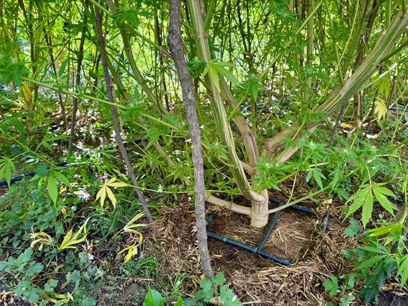 На терен с площ около 50 квадратни метра полицаите попаднаха на добре организирана система за отглеждане на канабис, включваща поливна инсталация, стълба, торове и различни препарати. Растенията, които наподобяваха дървета, бяха от различни хибридни сортове конопа.