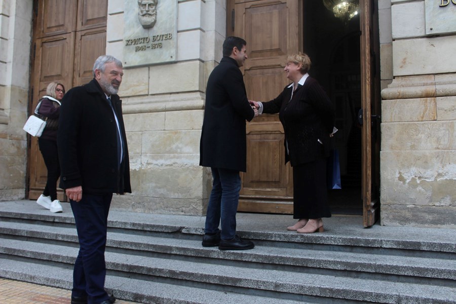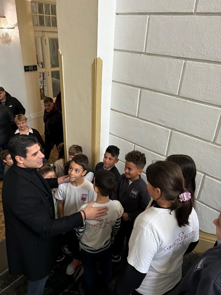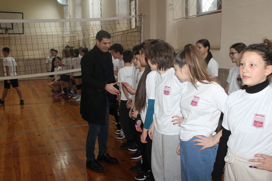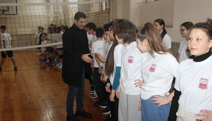 В училището, където се обучават близо 1000 ученици, президентът на БФС беше посрещнат от директора Марина Петкова. По време на визитата си той проведе среща с ученици от седми клас и волейболния отбор на гимназията.