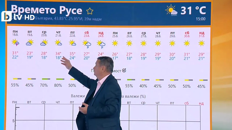 Най-горещ ще е петъчният ден за русенци, когато температурите ще достигат до 35 градуса. А най-ниски ще са уикенда и по-точно неделя, когато максималната температура ще е 24 градуса.