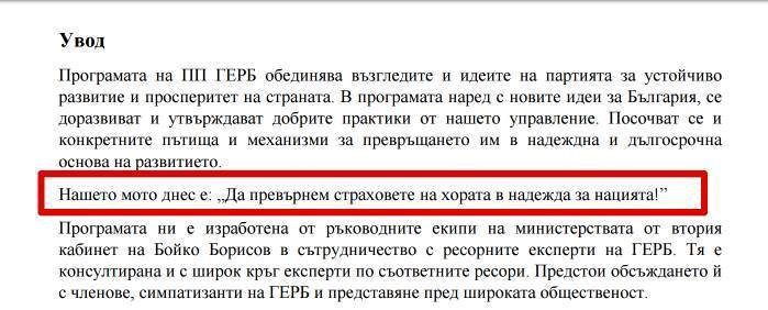 "Нашето мото днес е: "Да превърнем страховете на хората в надежда за нацията!" - с тези думи е описан слоганът на ГЕРБ за предстоящите избори, представен в увода на политическата програма на партията.