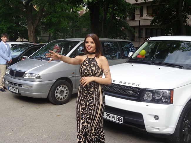 Тя пристигна с новия си джип “Рейндж роувър” за бала и паркира в двора на Националната гимназия по изкуствата “Добри Христов” във Варна. Звездата, чието чело бе украсено със скъпоценни камъни, веднага застана за фотосесия пред луксозната си кола.