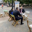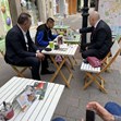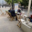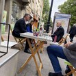 Тримата са седнали на открито на заведение до Пешеходния мост в града.