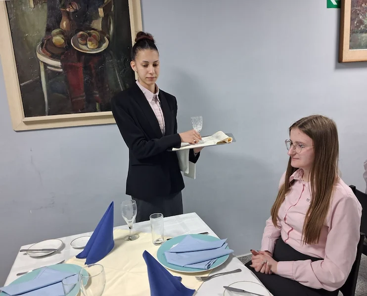 В категорията за сервиз единадесетокласничките Божидара Манолова и Симона Горлоева, с ръководител Йордан Адолфов, трябваше да подредят маса за двама и да презентират двустепенно меню. Вниманието към детайла кулминира в прецизно декантиране на червено вино. Божидара Манолова се отличи с най-високи резултати и продължава напред в състезанието.