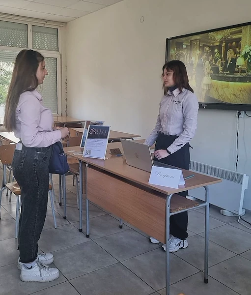 При бъдещите хотелиери предизвикателството беше разделено на два етапа. Учениците трябваше да посрещнат гост на рецепция, да презентират закупени услуги и устойчиви политики на хотела, както и да управляват процеса по напускане. Втората част включваше решаване на внезапно възникнал казус. Под ръководството на Радостина Христова се състезаваха дванадесетокласничките Джерен Феимова, Иванна Байрева и Лучия Астарджиева. След обсъждане комисията единодушно отреди първото място на Лучия Астарджиева, която ще представлява училището на следващия етап.