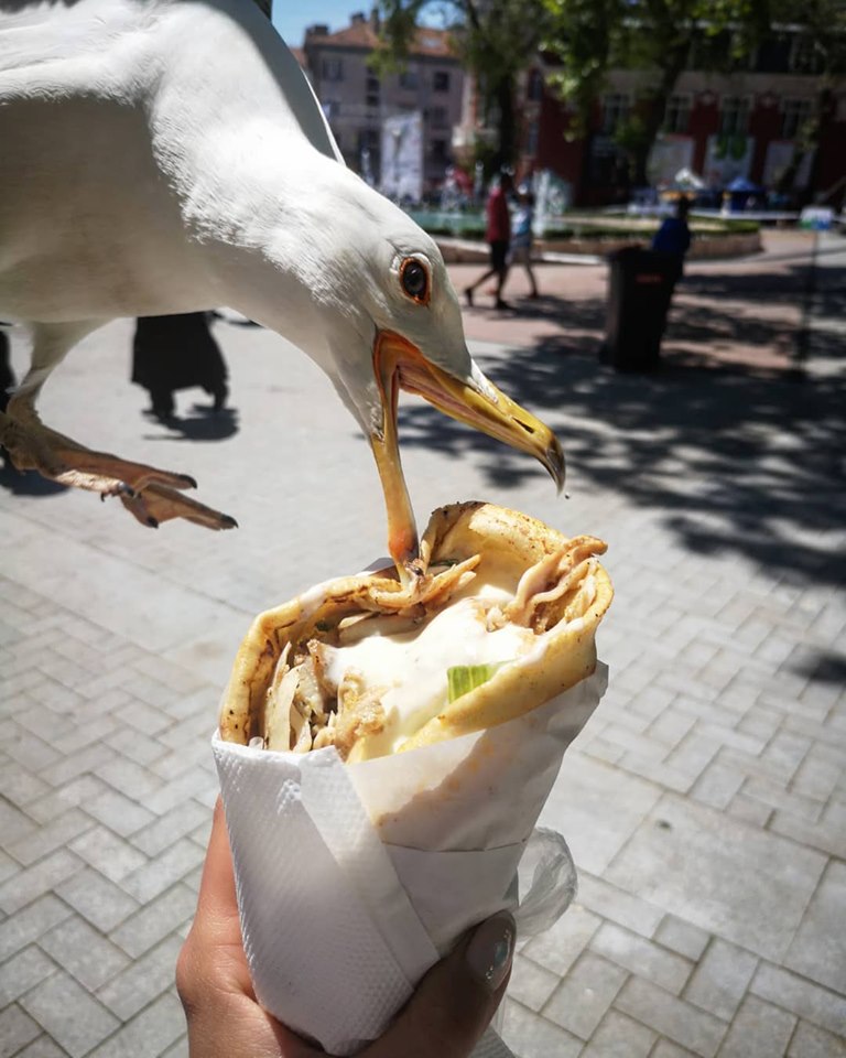 Впечатляващ кадър на посягащ към дюнер гларус, направен във Варна, доби голяма популярност в социалните групи през последните няколко дни.