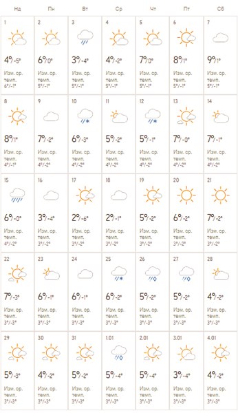 Коледните празници се очаква да преминат без валежи, със стара снежна покривка от валежите до 20 декември и максимални температури от 2 до 6 градуса. Динамизиране със затопляне на времето ще настъпи през последните дни на месеца, когато ще се затопли.