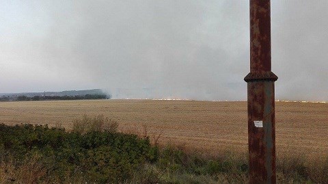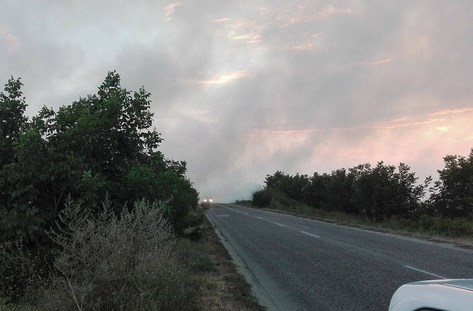 По първоначални данни огнената стихия е обхванала сухи треви след "Метро" посока София. Вече има голяма изпепелена територия от пожара, както и силно задимяване.