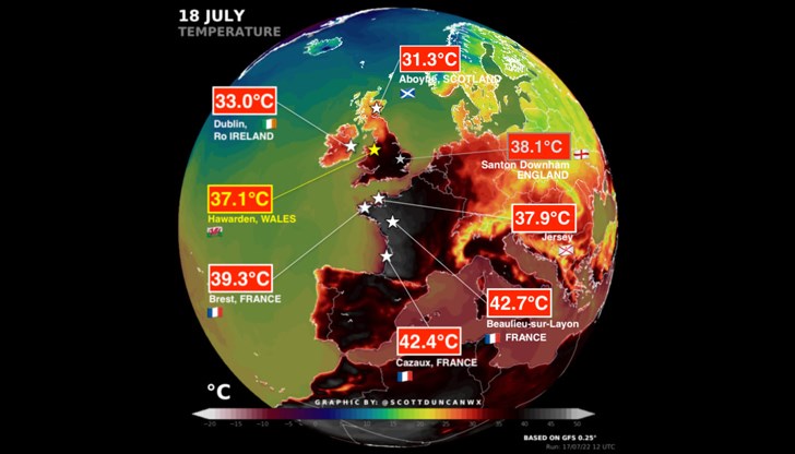 Историческият температурен рекорд във Великобритания сега е 38,7 градуса, измерени в Кеймбридж, Източна Англия, на 25 юли 2019 г. Днес обаче се очаква той да бъде подобрен, като дори бъде преминат прагът от 40 градуса.