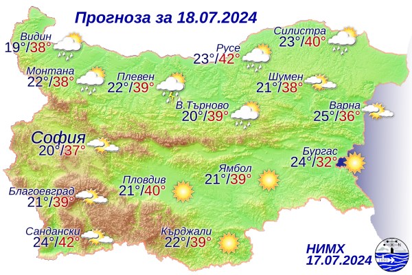 През деня температурите ще бъдат изключително високи, като се очакват максимални стойности между 37° и 42°, с най-високи температури в София около 37°. Въпреки слънчевото време, в следобедните часове в Северна България и планинските райони на Западна България ще се развива купеста и купесто-дъждовна облачност. На места ще има краткотрайни, но интензивни валежи, придружени от гръмотевици и временни усилвания на вятъра.