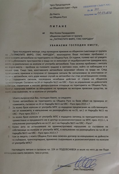 В свое поредно питане по темата до кмета Стоилов, Пазарджиев настоява за отговор по няколко възлови момента, касаещи свършеното от администрацията за изминалата 2015 година, а именно - общият брой автомобили на територията на общината, които са били обект на проверка от комисията за извършване на проверки на моторни превозни средства за които има съмнение, че са излезли от употреба, съгласно чл.34 от Наредба №15 на ОбС-Русе; за колко от моторните превозни средства, за които е сигурно, че представляват излезли от употреба, има издадени до собствениците им предписания, в изпълнение на разпоредбата на чл.35, ал.1 от цитираната наредба; какъв е броят на автомобилите за които е издадена заповед за принудителното им преместване; колко са актовете за установяване на административно нарушение, съставени на собственици на излезли от употреба МПС, в изпълнение на чл.38 от Наредба №15 и на последно място - кои са лицата, с които Община Русе има сключен договор за извършване на дейности по събиране, транспортиране, временно съхранение и разкомплектоване на излезли от употреба автомобили.