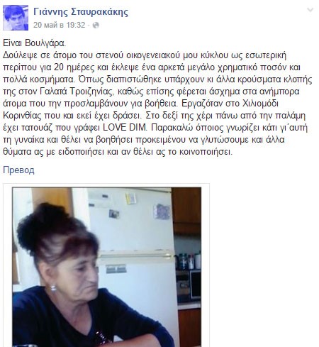 „Тя е българка. Работи в семейство на мои близки за около 20 дни на вътрешна работа, където открадна крупна парична сума и бижута. Установено е, че има и други случаи на кражба, където е работила, както и сведения за грубо отношение към болните хора, за които е наемана на работа да помага. На дясната си ръка върху дланта има татуировка LOVE DIM. Моля, всеки, който знае нещо за жената и иска да помогне, както и да бъдат спасени други жертви, нека ме уведоми", се казва в статуса на Янис Ставракакис.