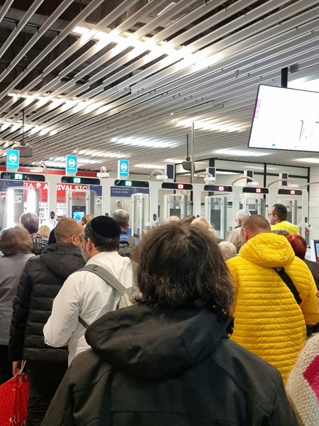 В неделния ден около 14 часа служителите не могат да обслужат пристигащите българи и туристи на Терминал 2. На гишетата са се струпали хора от няколко полета – Лондон Хийтроу, Тел Авив, Париж, Варшава и Амстердам. Това прави над 700 човека, като работят само 6 гишета. Всички пътници са натъпкани в един общ салон и без достатъчно въздух.