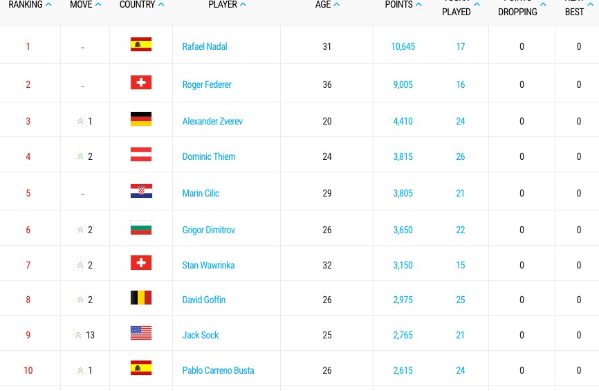 На 155 точки пред Григор на петото място е Марин Чилич от Хърватия, който го заемаше и миналата седмица. Четвъртата позиция е за Доминик Тийм от Австрия, който се придвижва с две места напред. Трети е Александър Зверев от Германия, а на върха е Рафаел Надал, следван от Роджър Федерер.