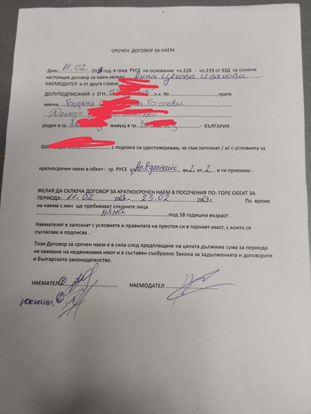 С моята приятелка си резервирахме апартамент под наем, (студентки сме задочно обучение) за период до 2 седмици. Чухме се с жената по телефона, разбрахме се, пратихме капаро, всичко, което се изискваше от нас бе изпълнено. На 11.02.2023 отидохме да се нанесем в жилището, посрещна ни хазяйката, настани ни и седнахме да подпишем договор и да платим остатъка от парите, за които сме се разбрали. След това тя ни заяви, че ще влиза в болница и видиш ли този апартамент бил по-близо до болницата, щяла да остане 3 дни в него с дъщеря си. Съгласихме се на това нейно условие, докато не ни вметна, че ако комшиите питат какво правим тук, да отговорим, че сме приятелки на дъщеря ѝ. Да не казваме, че сме тук на квартира. Срещнахме се с един от комшиите и го попитахме за жената и дали това е жилището, в което тя си живее или има друго. Човека ни каза, че реално това е жилището, което обитава. И се оказахме в такава ситуация, в която трябва да търпим нея и дъщеря ѝ. Веднага се свързах с адвокат и той ми обясни, че договора е толкова зле, че не е за коментиране, и има два варианта за действие, да говорим с нея да ни върне парите и да си ходим или да пуснем жалба в НАП и да се съдим.
