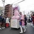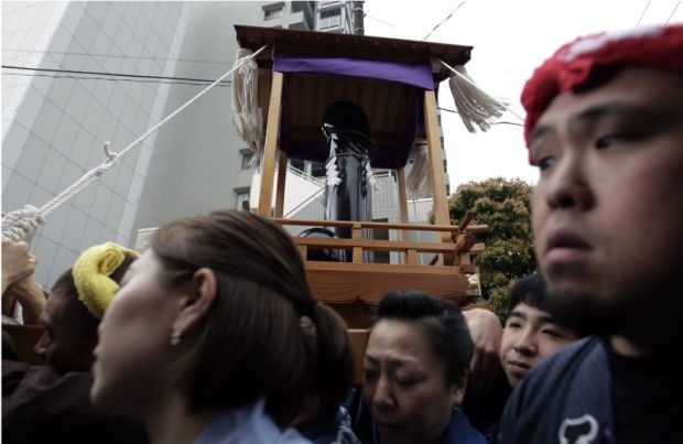 Участниците в Канамара Мацури, известен още като Фестивала на стоманения пенис, разнасят три огромни фалически форми.