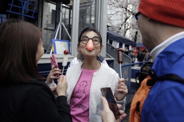 Деца и възрастни си купуват близалки с формата на пенис и позират пред скулптури, изобразяващи мъжки полови органи.