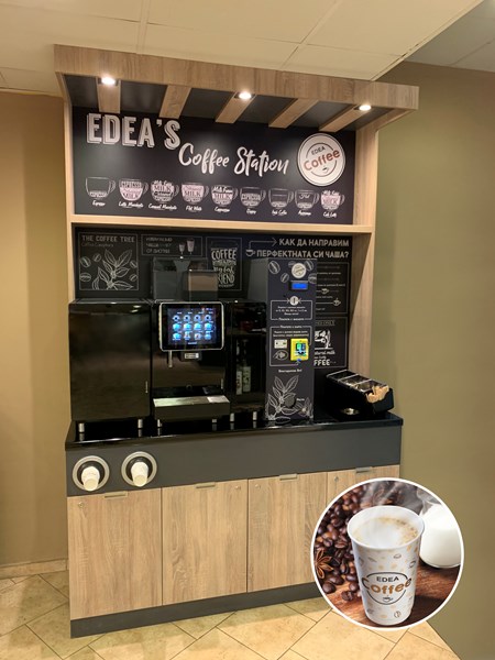 EDEA Koffee station предлага уникална комбинация между истинско мляко, 100% Арабика кафе и допълнителен вкус чрез сиропи по избор: лешник, бадем, карамел или ванилия. Кафето е създадено от подбрани сортове Арабика и изпечено специално за EDEA Koffee. Съчетанието между топла и студена пяна успява да задържи за дълго време гъстия каймак отгоре, което придава на напитката етажираност. Машината е швейцарска и гарантира винаги едно и също качество с три пръста страхотен каймак.
