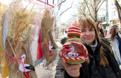 Екосергия е заредила и Светлана Миланова – ечемик, дрян, метли и кратунки са превърнати в оригинални мартеници за дома. Житото е събирано още миналото лято от шуменски ниви. Няма начин мартеница с пълни класове да не носи берекет за всяка къща, обяснява тя. Украсените метлички ще отворят път за добро в домовете. Шуменци най-много се радват и на семейните табелки за врати от чиста вълна в алено и бяло. Светлана изписва фамилии по поръчка. Само се моли да не идват поръчки с много дълги имена, защото писането с вълна не е лесно. Хит са и истинските издълбани кратунки, в които сред пръчки от напъпил дрян гнездят щъркели. Навремето с такива е било пълно в бита – пиели са вода, поливали са си при къпане за „честита баня”, спомнят си клиенти край сергията.