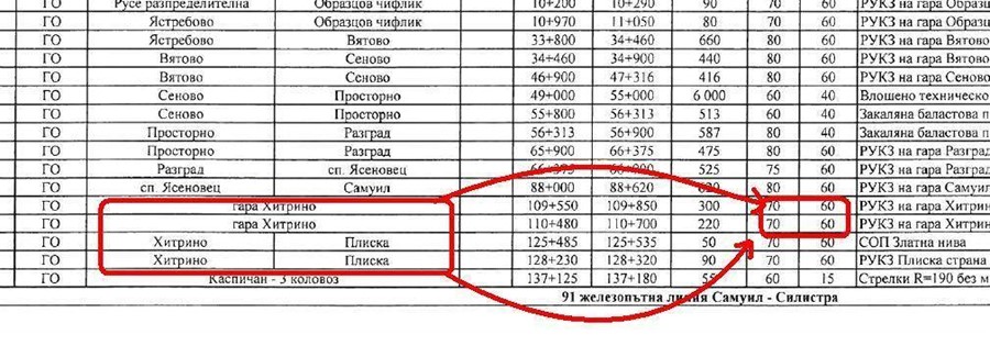 Официално разрешената скорост за междугарието (участъка между гарите) е 70 км в час по кривата с намаление до 60 км, както се вижда от таблицата, която давам и респективно 60 км за стрелка по главния коловоз и 40 км за стрелка с отклонение по страничен.