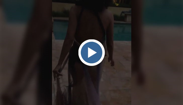 В него актрисата, съблича розово-черната си рокля на „Версаче“ след края на тазгодишната бляскавата церемония, и скача в басейн.