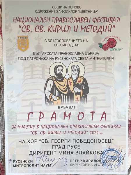 Първа награда спечели хор „Св. Георги Победоносец” при Общинския младежки дом в Русе на Третия национален православен фестивал „Св. Св. Кирил и Методий” в град Попово.