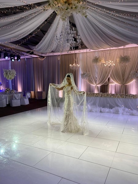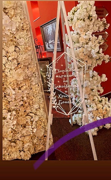 Двойката се венча в църквата "Свети Петър и Павел", а след това церемонията продължи в елегантно украсените зали "Париж" и "Москва" на хотела. Цветовете на украсата бяха бяло и екрю, а таванът на залите бе превърнат в небе от живи бели рози.