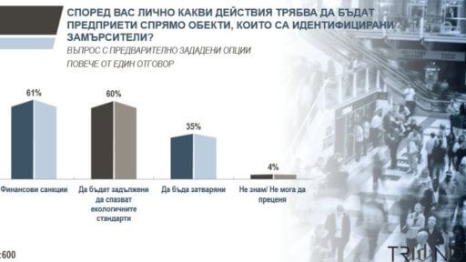 Въпреки чувствителността към екологичната проблематика в град Русе, като стане дума за действия, които трябва да бъдат предприети спрямо субектите, които са идентифицирани като замърсители, не се забелязва радикализъм в решенията. Доминиращото мнение е, че трябва да се наложат финансови санкции или дадената индустрия да бъде задължена да спазва екологичните стандарти. Близо два пъти по-малко са хората, които са за по-радикално разрешение на въпроса – чрез затваряне на производствата.