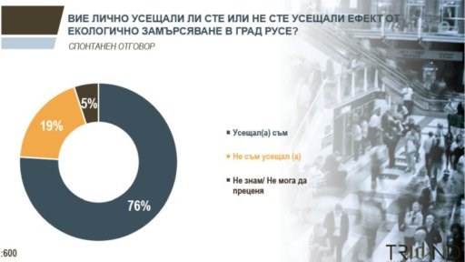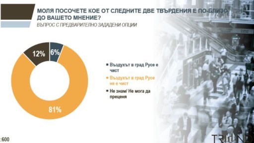 Традиционно в местни, а и в национални представителни проучвания, на въпрос за най-големите проблеми в дадено населено място или в България като цяло, почти винаги на първите две места излизат социалните теми – ниски доходи и безработица. Проучването в град Русе прави изключение, като най-често посочваният проблем е именно екологията и замърсяването на въздуха. Дори повече от половината от анкетираните, които са заявили, че изобщо не се интересуват от проблемите с околната среда, са на мнение, че в Русе има екологични проблеми. Това недвусмислено говори за остротата на проблема в града.