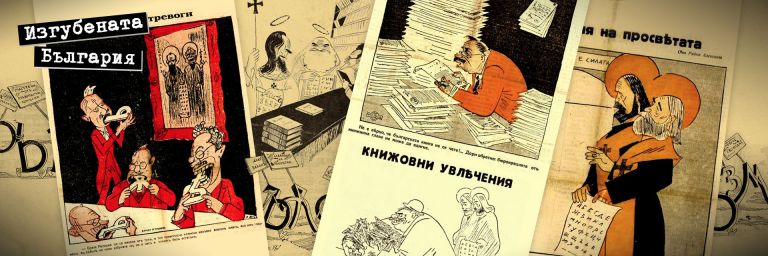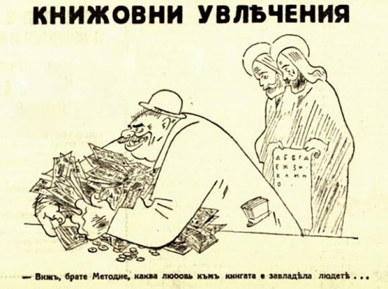 "Св. Кирил и Методий в гостоприемна София: – А бе, я по-добре ми дайте някой правописен речник..." (Карикатура на Александър Добринов, 1935 г.)
