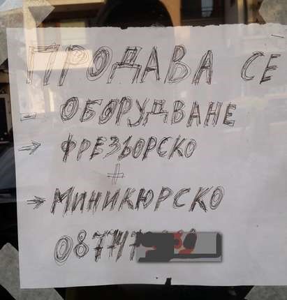 „Продава се оборудване. Фрезьорско + миникюрско”, гласи съобщението, залепено на вратата на търговския обект.
